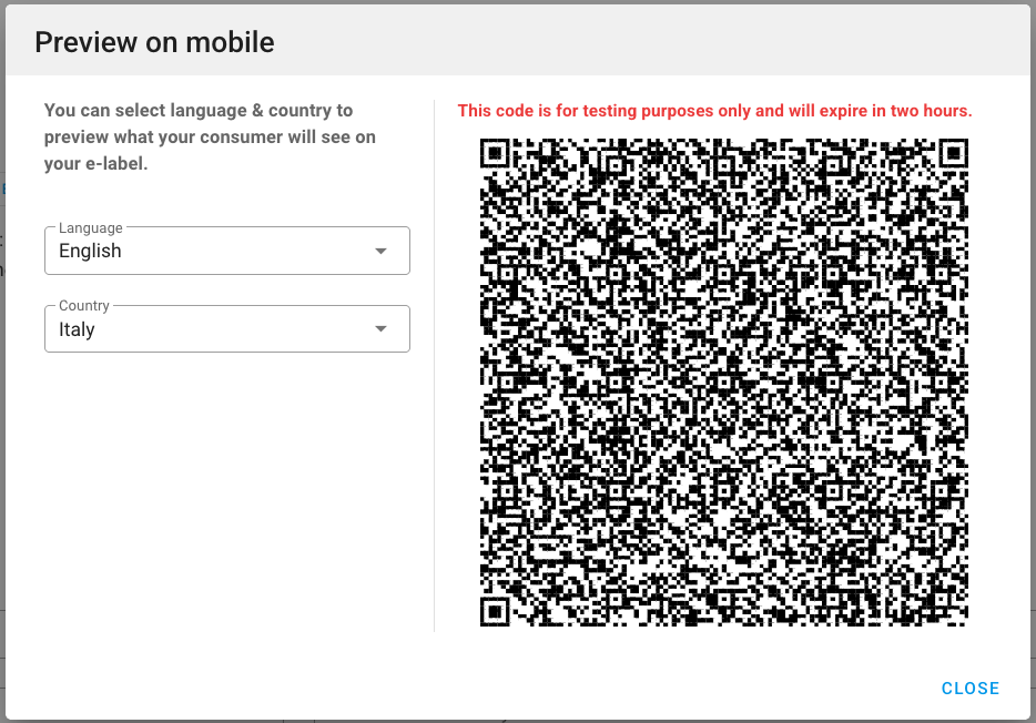 – Für E-Label können Sie Land und Sprache simulieren und sehen, wie die Ergebnisse auf Ihrem Mobilgerät aussehen.