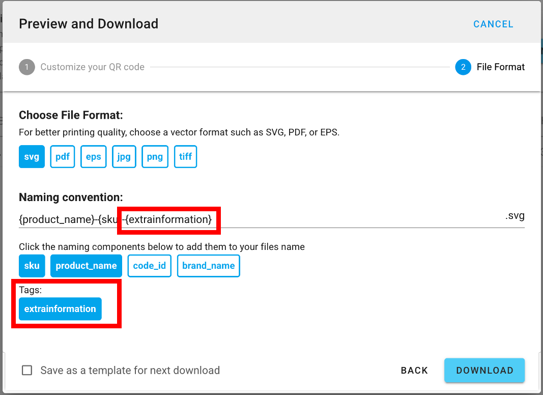 6. Beim Herunterladen des QR-Codes können Sie den TAG-WERT sogar in die Namenskonvention Ihrer Download-Datei aufnehmen.