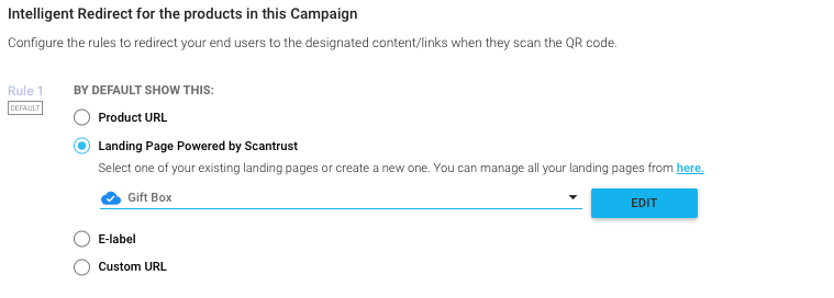 - Wählen Sie die Registerkarte „Landing Page Powered by Scantrust“. (Regel 1, die Rückfallregel)
