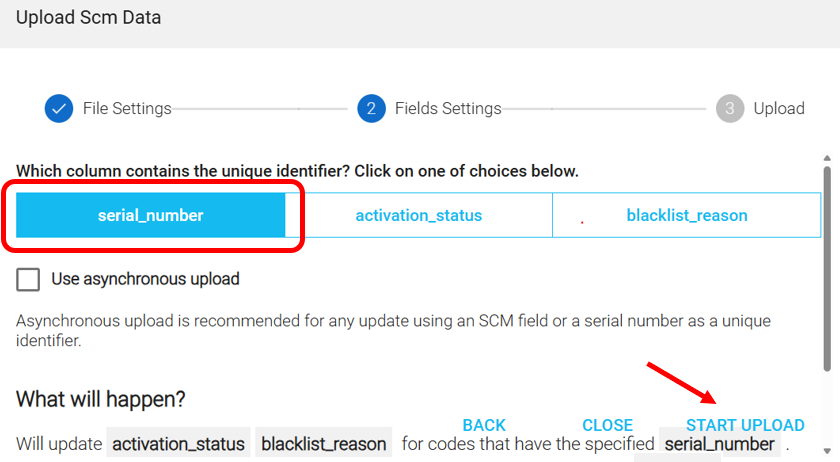 8. Klicken Sie auf die erste Spalte „Seriennummer“ und dann auf „UPLOAD STARTEN“: