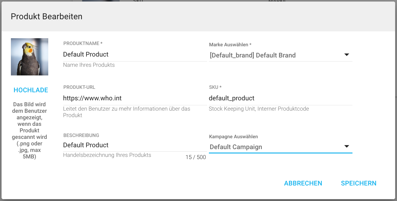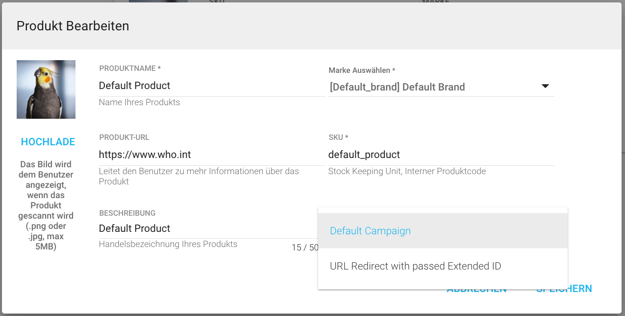 7. Jedes Feld kann bearbeitet werden. Nur die SKU muss in Ihrem Unternehmen eindeutig sein. Mit Ausnahme von „Brand“ und „Campaign“ sind alle Felder Freitextfelder. Wählen Sie für diese beiden Felder aus der vorhandenen Auswahl über das Dropdown-Menü aus: