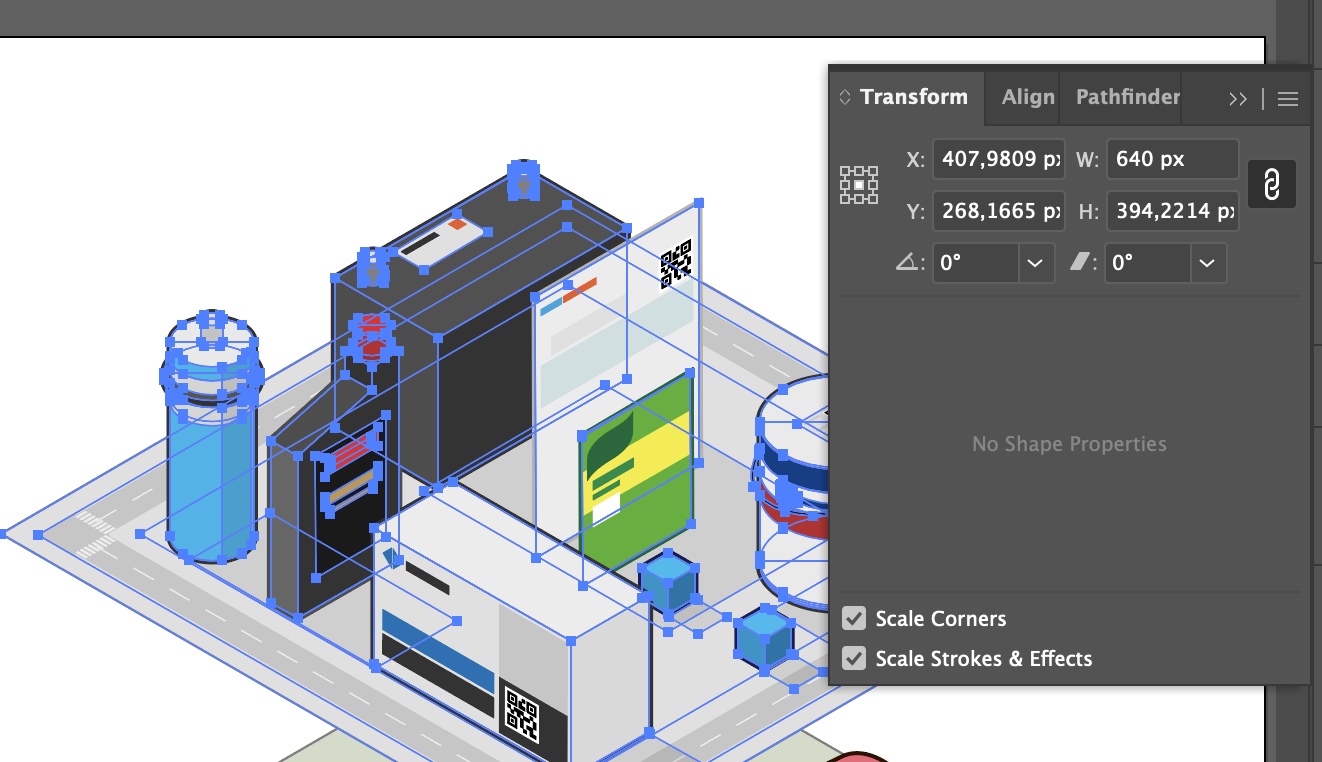 Stellen Sie als Nächstes sicher, dass Sie den QR-Code ausgewählt haben, den Sie bearbeiten möchten, und stellen Sie dann sicher, dass die Optionen „Ecken skalieren“ und „Striche und Effekte skalieren“ ausgewählt sind. Sehen Sie sich das Bild unten an, um zu sehen, wie dies aussehen sollte: