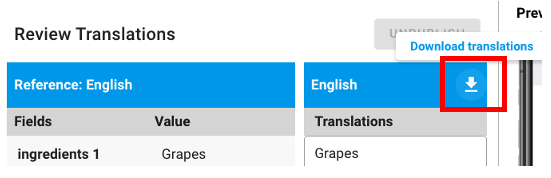 It is possible to download the translations into a CSV for easy distribution to translators, 1 file per language: