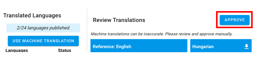 Note: The machine translation feature will override any existing translated strings. If you already have translated some strings, we recommend you to use the machine translation for a single language instead: