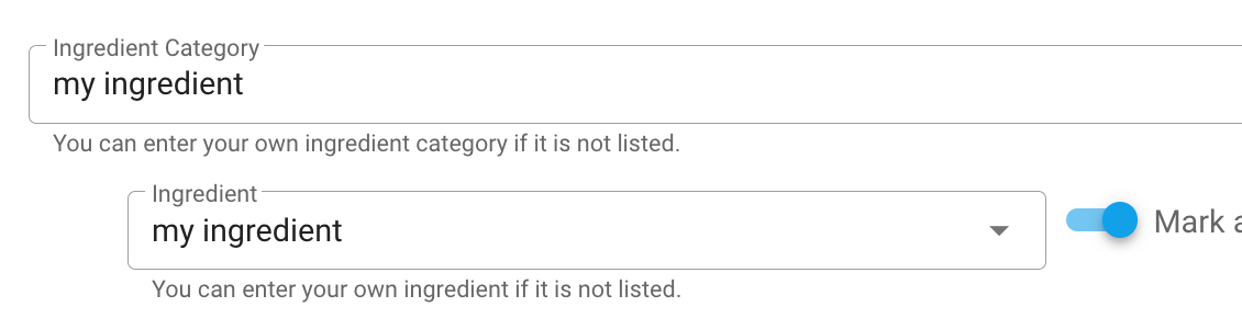 • Ingredients can be marked as allergens via the toggle to the right of the ingredient, it will then be highlighted in bold in the ingredients summary.