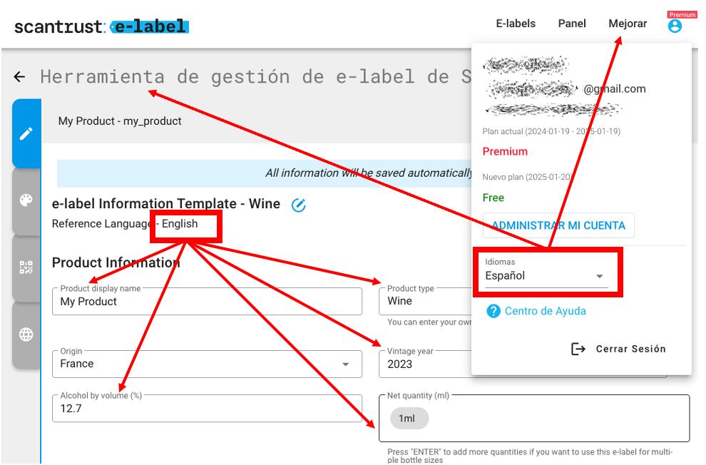 El portal se mostrará en el idioma X y el editor de etiquetas electrónicas se mostrará en el idioma Y.