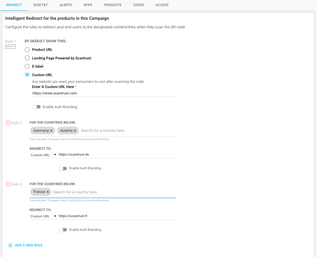 Se pueden configurar diferentes reglas de redireccionamiento por país o grupo de países, según la ubicación del usuario al momento del escaneo.
