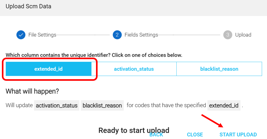 8. Luego, haga clic en la primera columna: "extended_id" y haga clic en INICIAR CARGA.