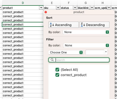 4. Verifique el archivo descargado para asegurarse de que cada entrada de esa orden de trabajo contenga la información correcta del producto: