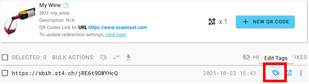 1. Dans le Gestionnaire de QR Code, accédez à un produit et cliquez sur « Obtenir le code QR ».