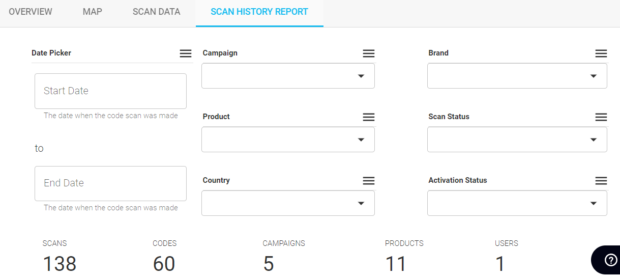 Inoltre, sulla sinistra, vedrai tutti i filtri che puoi applicare, comprese le informazioni sul codice, le informazioni sul prodotto, le informazioni sullo scanner (ID utente), le informazioni sull'applicazione e i campi SCM -> maggiori dettagli su ciascun campo di seguito: