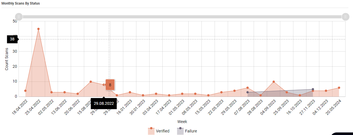 Per impostazione predefinita, i dati vengono filtrati per l'ultimo mese. Se durante quel periodo sono state eseguite più di 2000 scansioni, verrà visualizzato un messaggio di avviso che informa che vengono visualizzate 2000 scansioni di 2000+X: