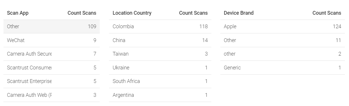 La casella dell'app di scansione mostra quali app sono state utilizzate per interagire con il tuo prodotto. Era la tua app dedicata? Un'app Scantrust? Una specifica applicazione di terze parti? Se vedi un numero elevato di scansioni per un'app (come WeChat, un'app utilizzata prevalentemente dai consumatori cinesi), ti consigliamo di verificare con il tuo reparto marketing per vedere se hanno esaurito le risorse disponibili per il coinvolgimento dei consumatori tramite questa applicazione: