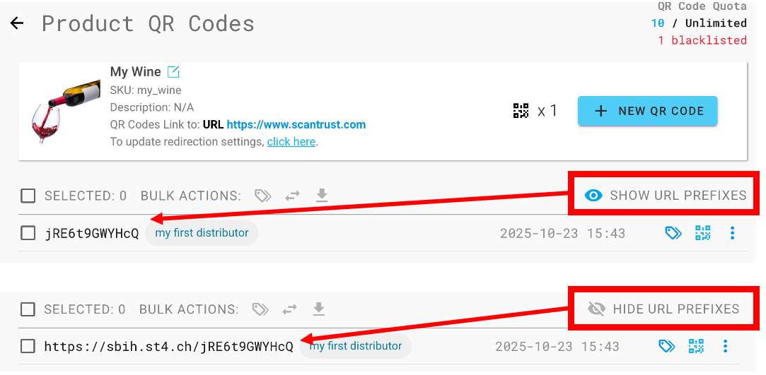 3.º Encontre o produto para o qual necessita do URL e clique em OBTER CÓDIGOS QR.