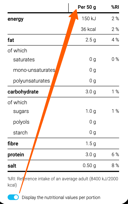 Se tiver fornecido valores por porção, os consumidores poderão alternar entre a visualização das informações nutricionais (e a percentagem das ingestões de referência, se ativada) por 100 ml/g ou por porção.