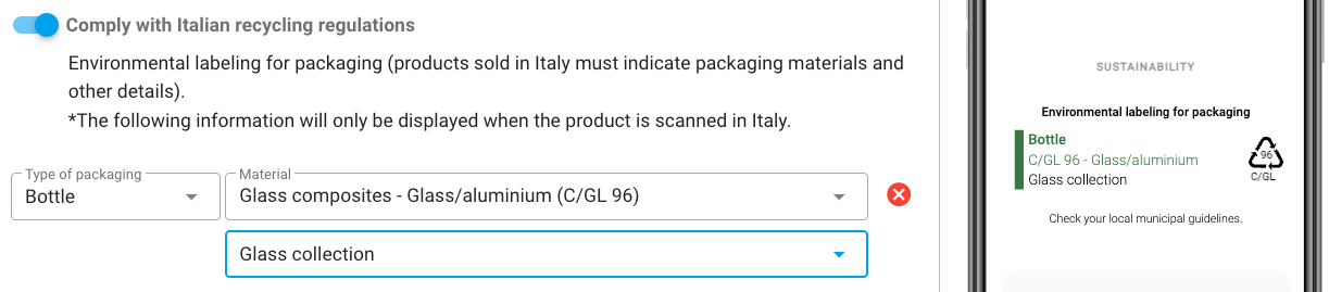 電子標籤 - 故障排除 - 回收訊息 確保電子標籤上正確顯示回收資訊對於合規性和為最終用戶提供準確的可持續性指導至關重要。回收資訊目前將以所有語言顯示在預覽畫面上,但是當掃描實際代碼時,只有來自義大利的掃描代碼的人才能看到: 还有其它问题?提交请求 评论