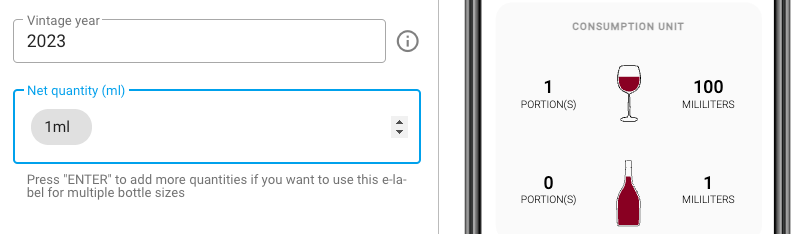 電子標籤 - 故障排除 - 消耗單位 - Enterprise 無論您遇到數據差異、設定消費單位的挑戰還是電子標籤系統中的意外行為,本指南都會引導您了解常見問題及其解決方案,以確保無縫體驗。1. 如果淨含量少於 1 毫升,則不會出現瓶子標誌: 2. 如果在「消耗單位欄位」欄位中沒有輸入值,則消耗單位部分將消失: 还有其它问题?提交请求 评论