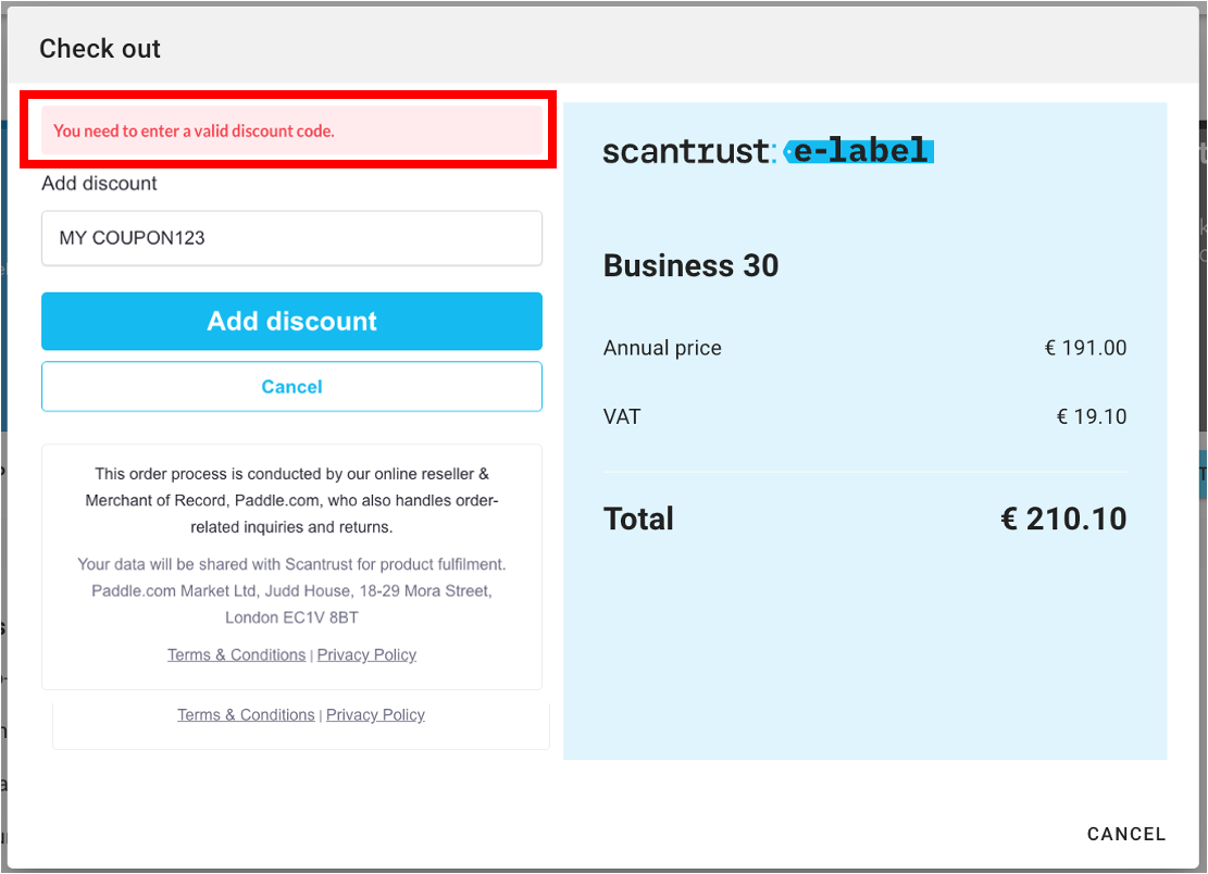 電子標籤入口網站 - 訂閱 - 優惠券代碼申請 本文將引導您完成無縫應用折扣代碼的步驟:1. 點選添加折扣:2. 輸入折扣碼並點選添加折扣:3. 折扣成功應用後,結帳介面左上角會顯示:4. 如果您輸入的代碼不正確或無法套用,則會出現警告 还有其它问题?提交请求 评论