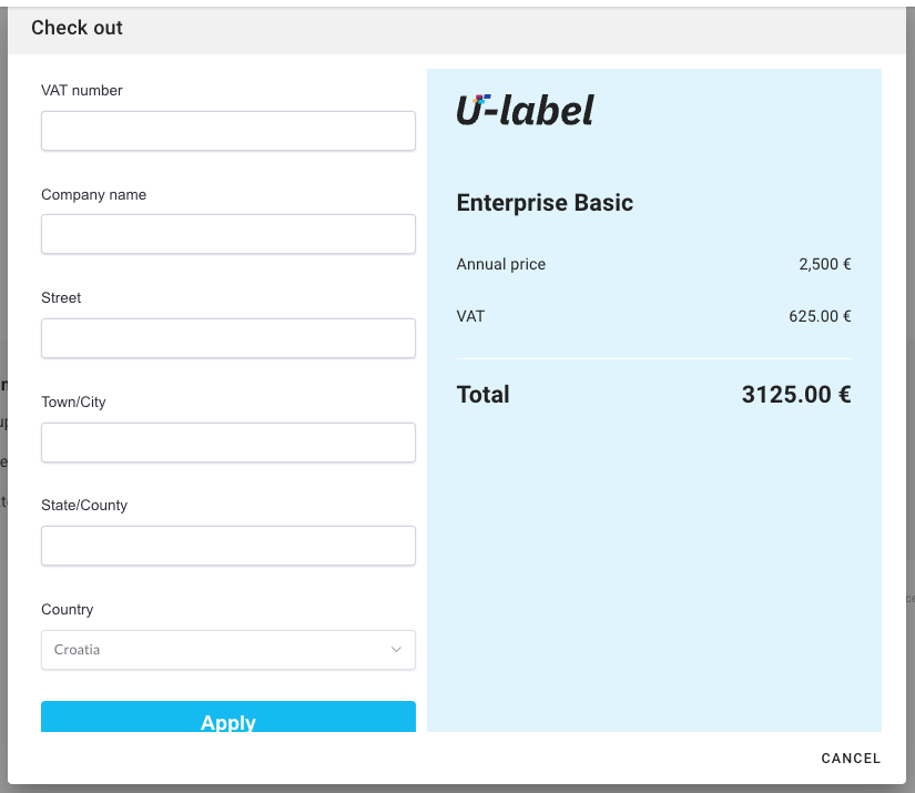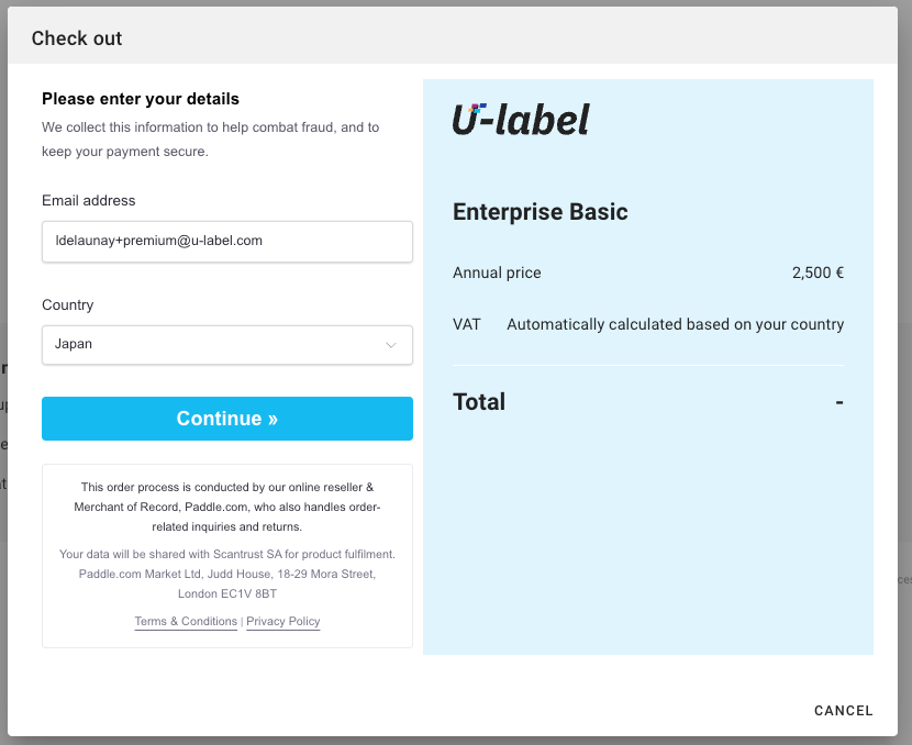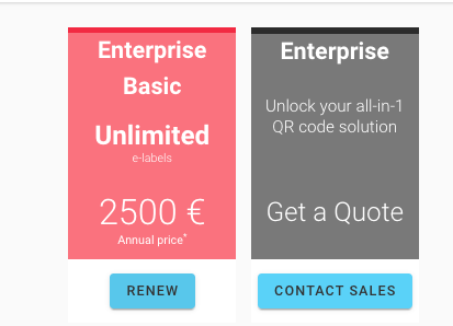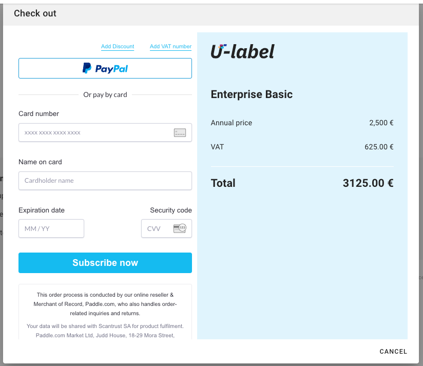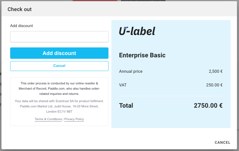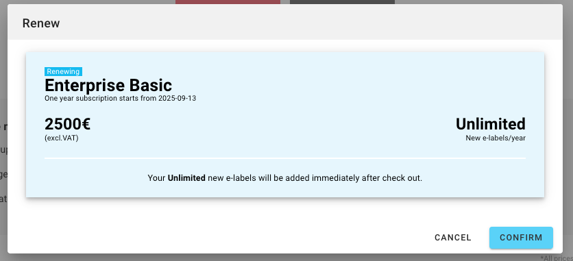 e-label Enterprise Basic - 使用 Scantrust 的 U-label 續訂 遷移後,要續訂您的計劃,請按照以下步驟操作:1. 進入漢堡選單並找到以下部分:電子標籤計畫:2.點選續訂:3.確認您的選擇:4. 完成以下畫面:5. 新增折扣和/或公司增值稅資訊(如適用):6. 輸入完所有內容後,點選立即訂閱: 还有其它问题?提交请求 评论
