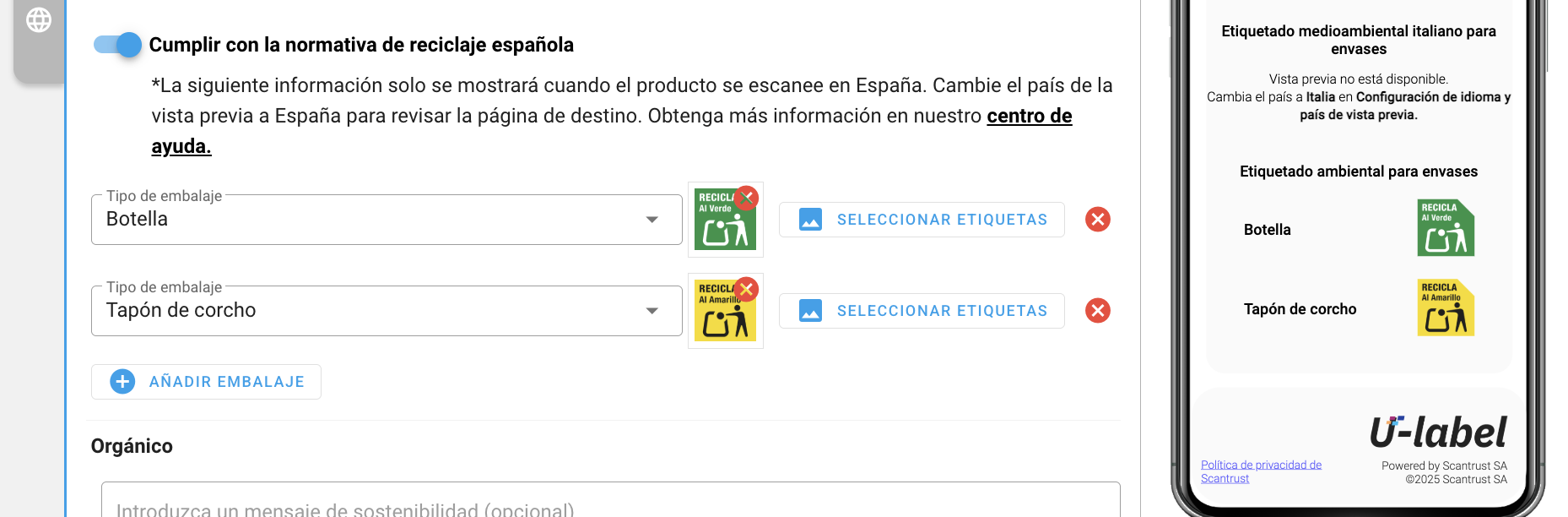 1. 在電子標籤編輯器中,前往可回收性部分,然後將「遵守西班牙回收法規」開啟為「開啟」。然後點選新增包裝: