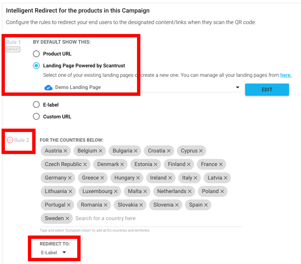 本文仅展示了在指定国家/地区(示例中我们使用欧盟国家/地区)内重定向到电子标签内容的具体设置,以及欧盟境外每个国家/地区的落地页重定向。有关如何配置其他国家/地区重定向的更多详细信息,请参阅文章:基于国家/地区的重定向。